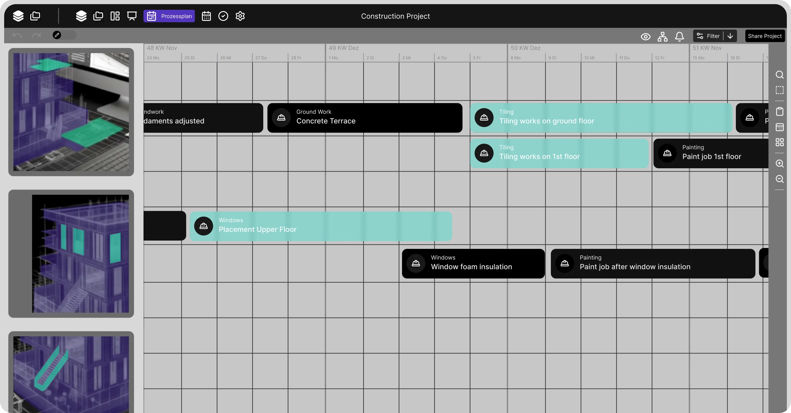 Link dates, zones, and trades directly to your 3D model. Progress, conflicts, and risks become visible, making planning tangible and transparent for your team and project owners.